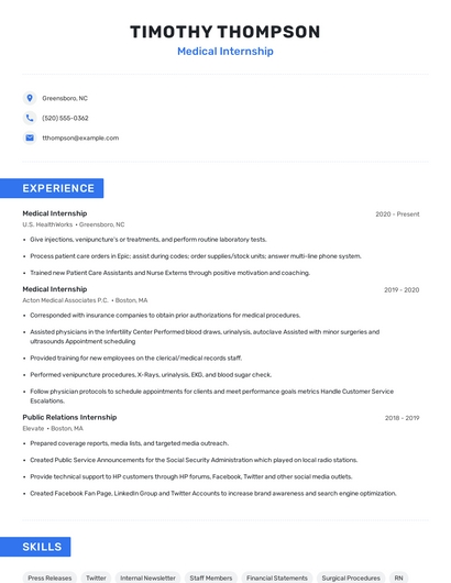 Build a professional medical internship resume in minutes. Browse through our resume examples to identify the best way to word your resume. Then choose from 5+ resume templates to create your medical internship resume.