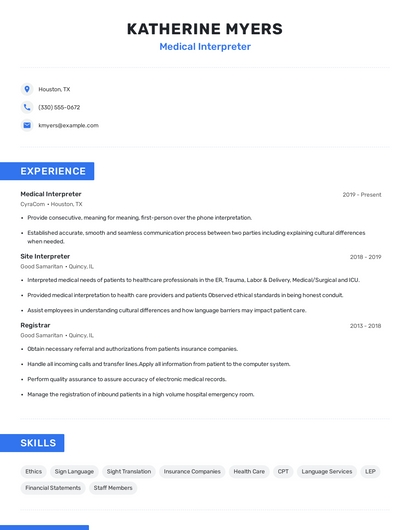 Build a professional medical interpreter resume in minutes. Browse through our resume examples to identify the best way to word your resume. Then choose from 5+ resume templates to create your medical interpreter resume.