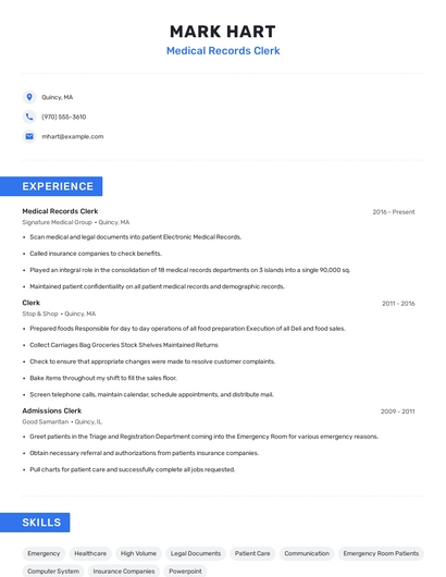 Build a professional medical records clerk resume in minutes. Browse through our resume examples to identify the best way to word your resume. Then choose from 5+ resume templates to create your medical records clerk resume.