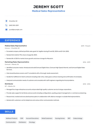 Build a professional medical sales representative resume in minutes. Browse through our resume examples to identify the best way to word your resume. Then choose from 5+ resume templates to create your medical sales representative resume.