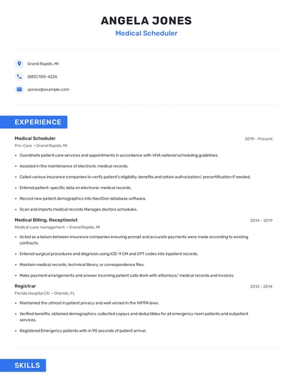 Build a professional medical scheduler resume in minutes. Browse through our resume examples to identify the best way to word your resume. Then choose from 5+ resume templates to create your medical scheduler resume.