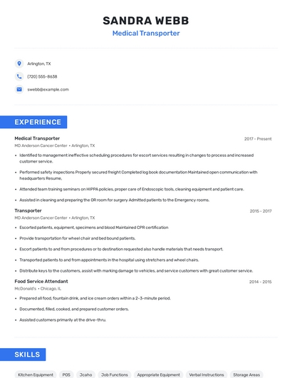 Build a professional medical transporter resume in minutes. Browse through our resume examples to identify the best way to word your resume. Then choose from 5+ resume templates to create your medical transporter resume.
