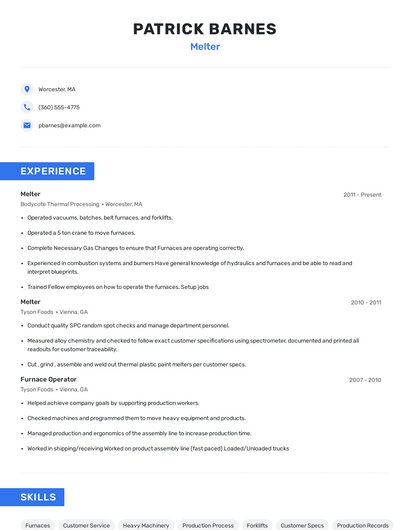 Build a professional melter resume in minutes. Our AI resume writing assistant will guide you through every step of the process, and you can choose from 10+ resume templates to create your melter resume.7. Hoists
