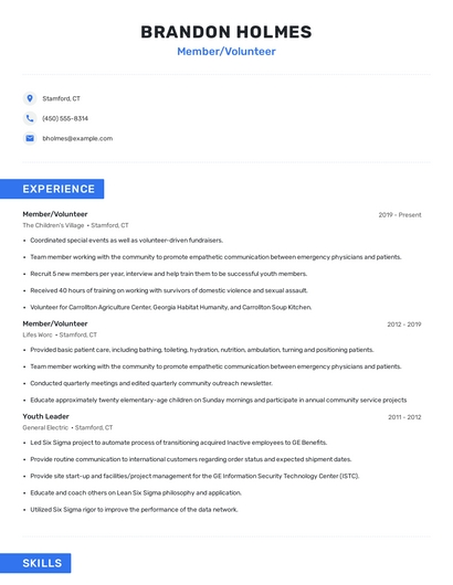Build a professional member/volunteer resume in minutes. Browse through our resume examples to identify the best way to word your resume. Then choose from 5+ resume templates to create your member/volunteer resume.