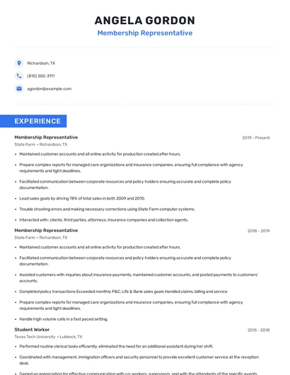 Build a professional membership representative resume in minutes. Browse through our resume examples to identify the best way to word your resume. Then choose from 5+ resume templates to create your membership representative resume.