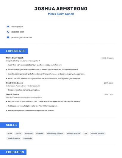 The most important skills for a men's swim coach resume and required skills for a men's swim coach to have include: