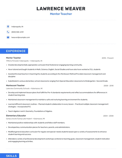 Build a professional mentor teacher resume in minutes. Browse through our resume examples to identify the best way to word your resume. Then choose from 5+ resume templates to create your mentor teacher resume.