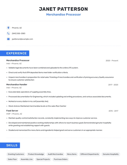 Build a professional merchandise processor resume in minutes. Browse through our resume examples to identify the best way to word your resume. Then choose from 5+ resume templates to create your merchandise processor resume.