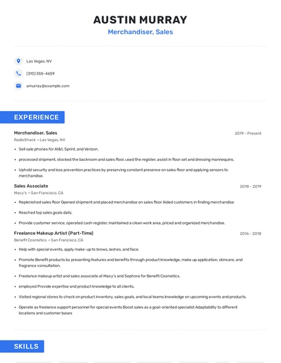 Build a professional merchandiser, sales resume in minutes. Browse through our resume examples to identify the best way to word your resume. Then choose from 5+ resume templates to create your merchandiser, sales resume.