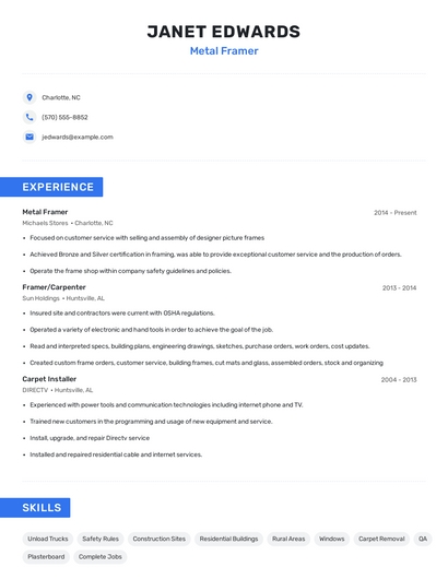 Build a professional metal framer resume in minutes. Browse through our resume examples to identify the best way to word your resume. Then choose from 5+ resume templates to create your metal framer resume.