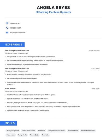 Build a professional metalizing machine operator resume in minutes. Browse through our resume examples to identify the best way to word your resume. Then choose from 5+ resume templates to create your metalizing machine operator resume.