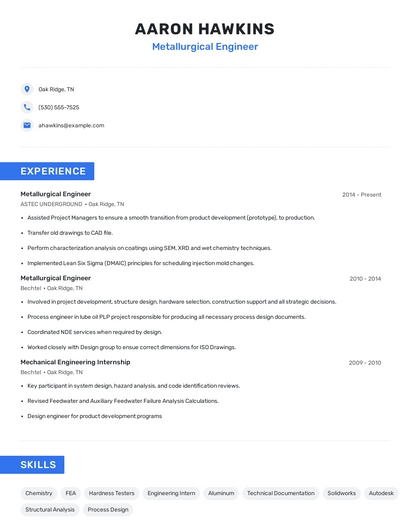 Build a professional metallurgical engineer resume in minutes. Browse through our resume examples to identify the best way to word your resume. Then choose from 5+ resume templates to create your metallurgical engineer resume.