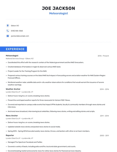 Build a professional meteorologist resume in minutes. Browse through our resume examples to identify the best way to word your resume. Then choose from 5+ resume templates to create your meteorologist resume.
