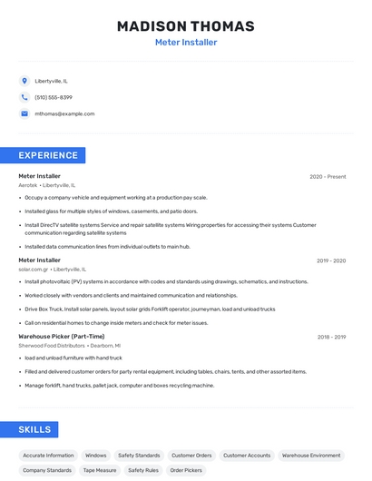 Build a professional meter installer resume in minutes. Browse through our resume examples to identify the best way to word your resume. Then choose from 5+ resume templates to create your meter installer resume.