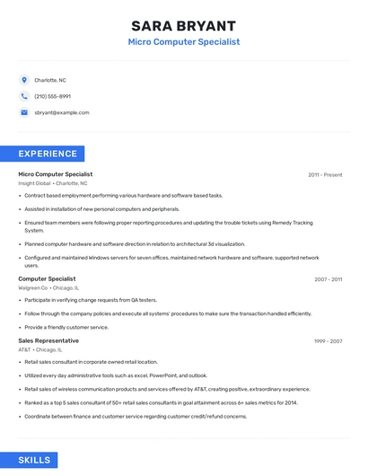 Build a professional micro computer specialist resume in minutes. Browse through our resume examples to identify the best way to word your resume. Then choose from 5+ resume templates to create your micro computer specialist resume.