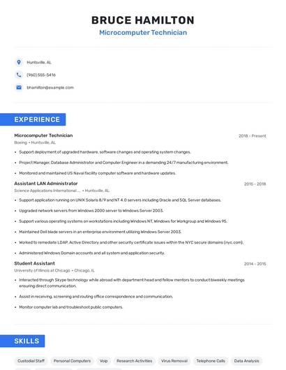 Build a professional microcomputer technician resume in minutes. Browse through our resume examples to identify the best way to word your resume. Then choose from 5+ resume templates to create your microcomputer technician resume.