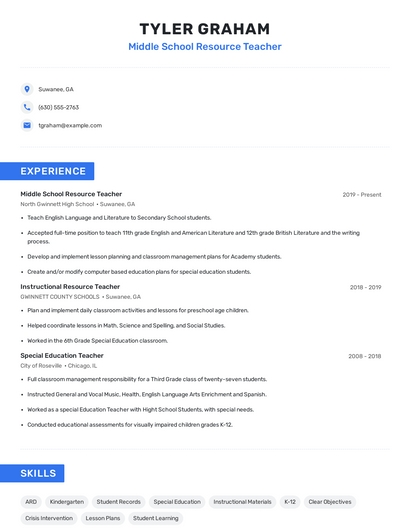 Choose from 10+ customizable middle school resource teacher resume templates