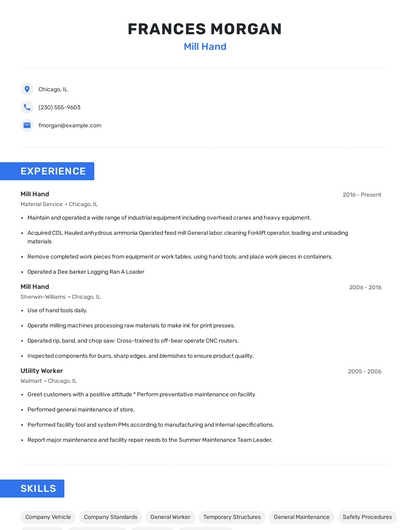 Build a professional mill hand resume in minutes. Our AI resume writing assistant will guide you through every step of the process, and you can choose from 10+ resume templates to create your mill hand resume.What skills help Mill Hands find jobs?