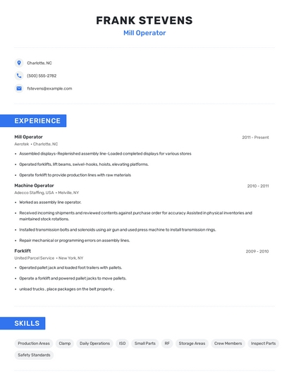 Build a professional mill operator resume in minutes. Browse through our resume examples to identify the best way to word your resume. Then choose from 5+ resume templates to create your mill operator resume.