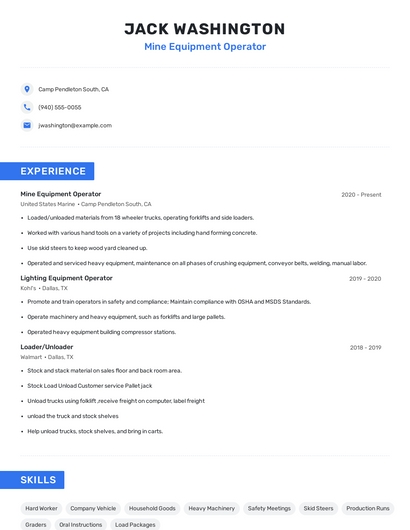 Build a professional mine equipment operator resume in minutes. Browse through our resume examples to identify the best way to word your resume. Then choose from 5+ resume templates to create your mine equipment operator resume.