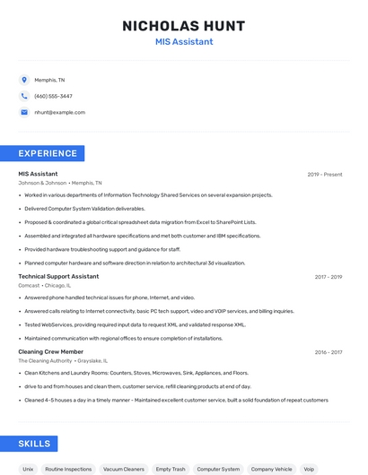 Build a professional mis assistant resume in minutes. Browse through our resume examples to identify the best way to word your resume. Then choose from 5+ resume templates to create your mis assistant resume.