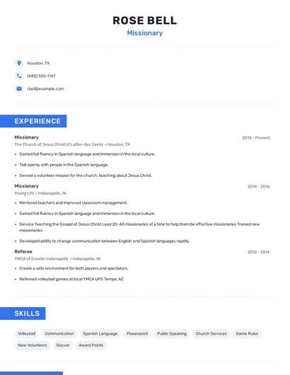 Build a professional missionary resume in minutes. Our AI resume writing assistant will guide you through every step of the process, and you can choose from 10+ resume templates to create your missionary resume.7. Leadership
