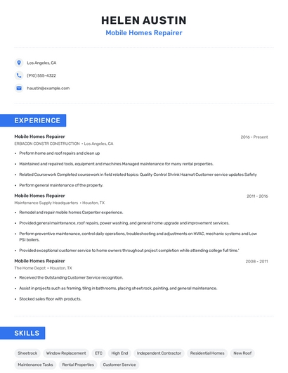Build a professional mobile homes repairer resume in minutes. Browse through our resume examples to identify the best way to word your resume. Then choose from 5+ resume templates to create your mobile homes repairer resume.