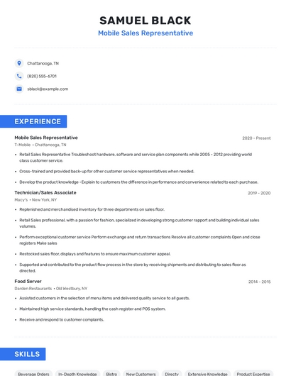 Build a professional mobile sales representative resume in minutes. Browse through our resume examples to identify the best way to word your resume. Then choose from 5+ resume templates to create your mobile sales representative resume.