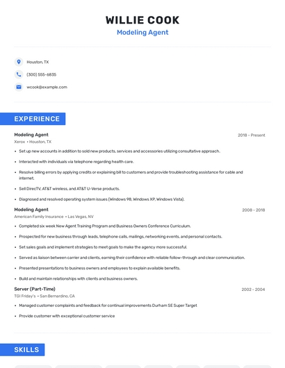The most important skills for a modeling agent resume and required skills for a modeling agent to have include: