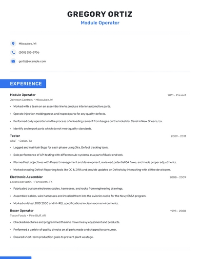Build a professional module operator resume in minutes. Browse through our resume examples to identify the best way to word your resume. Then choose from 5+ resume templates to create your module operator resume.