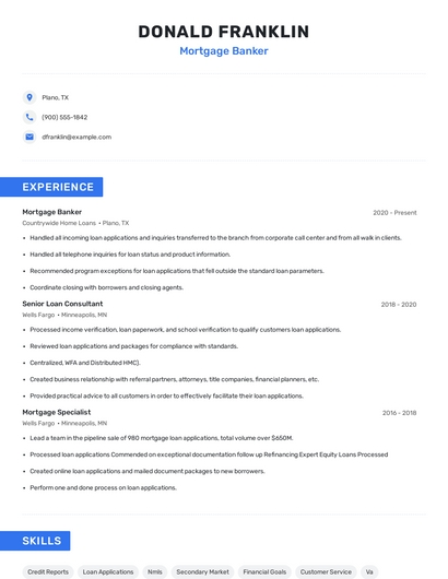 Build a professional mortgage banker resume in minutes. Browse through our resume examples to identify the best way to word your resume. Then choose from 5+ resume templates to create your mortgage banker resume.