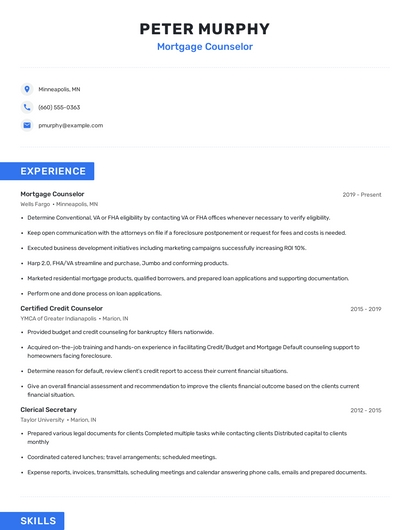 Build a professional mortgage counselor resume in minutes. Browse through our resume examples to identify the best way to word your resume. Then choose from 5+ resume templates to create your mortgage counselor resume.