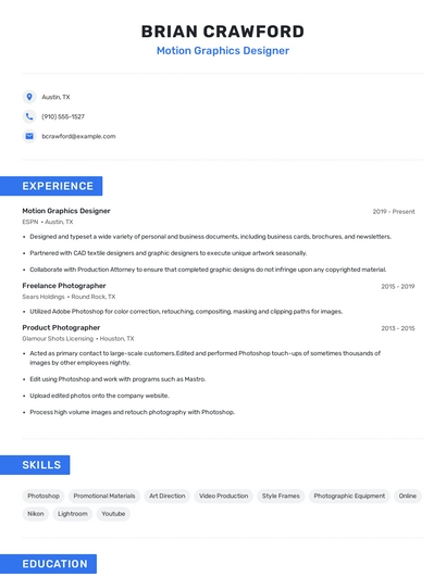 Build a professional motion graphics designer resume in minutes. Browse through our resume examples to identify the best way to word your resume. Then choose from 5+ resume templates to create your motion graphics designer resume.