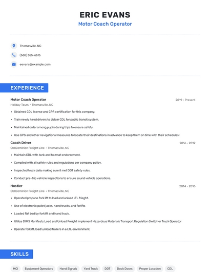 Build a professional motor coach operator resume in minutes. Browse through our resume examples to identify the best way to word your resume. Then choose from 5+ resume templates to create your motor coach operator resume.