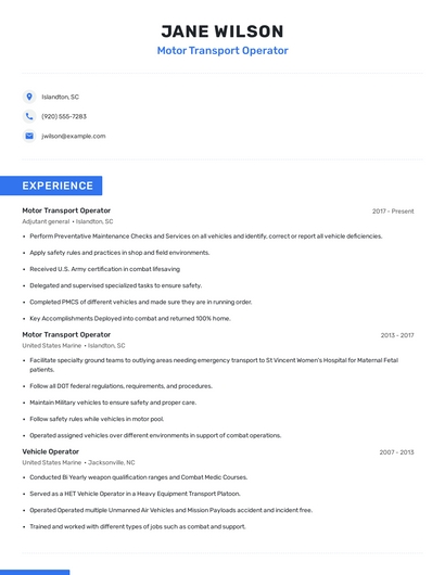Build a professional motor transport operator resume in minutes. Browse through our resume examples to identify the best way to word your resume. Then choose from 5+ resume templates to create your motor transport operator resume.