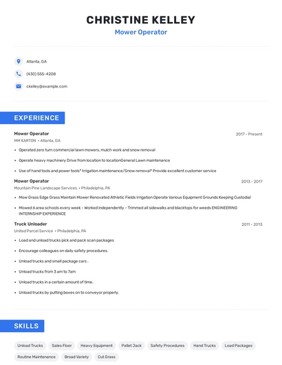 Build a professional mower operator resume in minutes. Browse through our resume examples to identify the best way to word your resume. Then choose from 5+ resume templates to create your mower operator resume.