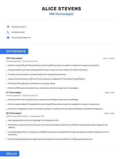 Build a professional mri technologist resume in minutes. Browse through our resume examples to identify the best way to word your resume. Then choose from 5+ resume templates to create your mri technologist resume.