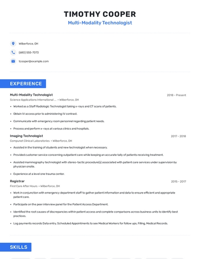 Build a professional multi-modality technologist resume in minutes. Browse through our resume examples to identify the best way to word your resume. Then choose from 5+ resume templates to create your multi-modality technologist resume.