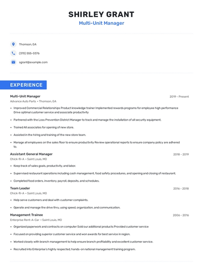 Build a professional multi-unit manager resume in minutes. Browse through our resume examples to identify the best way to word your resume. Then choose from 5+ resume templates to create your multi-unit manager resume.
