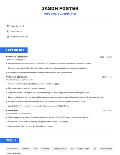 Build a professional multimedia coordinator resume in minutes. Browse through our resume examples to identify the best way to word your resume. Then choose from 5+ resume templates to create your multimedia coordinator resume.