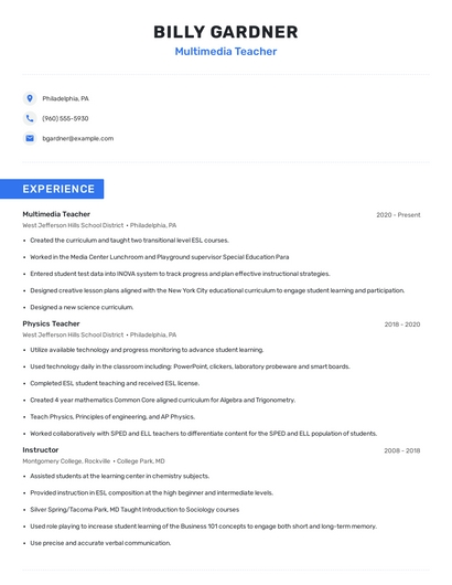 Build a professional multimedia teacher resume in minutes. Our AI resume writing assistant will guide you through every step of the process, and you can choose from 10+ resume templates to create your multimedia teacher resume.What skills help Multimedia Teachers find jobs?