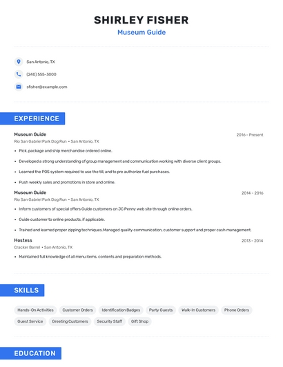 Build a professional museum guide resume in minutes. Our AI resume writing assistant will guide you through every step of the process, and you can choose from 10+ resume templates to create your museum guide resume.7. Museum Events