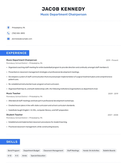 Build a professional music department chairperson resume in minutes. Our AI resume writing assistant will guide you through every step of the process, and you can choose from 10+ resume templates to create your music department chairperson resume.7. Chorus