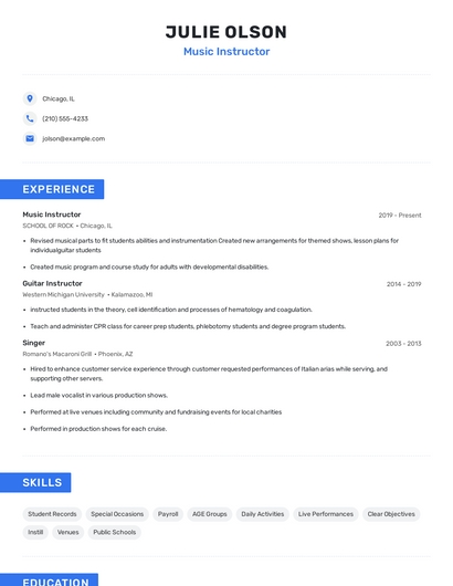 Build a professional music instructor resume in minutes. Browse through our resume examples to identify the best way to word your resume. Then choose from 5+ resume templates to create your music instructor resume.