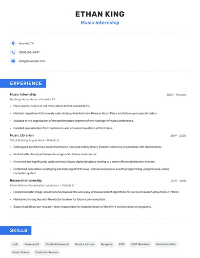 Build a professional music internship resume in minutes. Browse through our resume examples to identify the best way to word your resume. Then choose from 5+ resume templates to create your music internship resume.