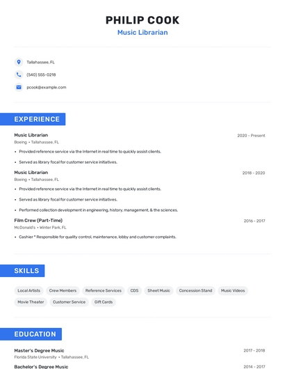 Build a professional music librarian resume in minutes. Browse through our resume examples to identify the best way to word your resume. Then choose from 5+ resume templates to create your music librarian resume.