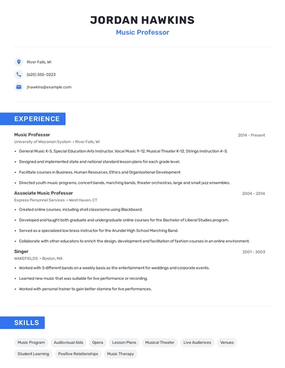 Build a professional music professor resume in minutes. Our AI resume writing assistant will guide you through every step of the process, and you can choose from 10+ resume templates to create your music professor resume.7. Course Objectives