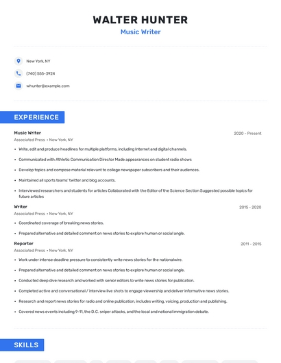 The most important skills for a music writer resume and required skills for a music writer to have include: