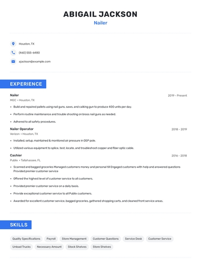 The most important skills for a nailer resume and required skills for a nailer to have include: