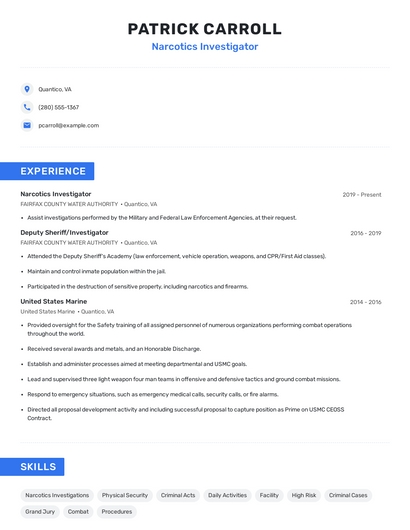 Build a professional narcotics investigator resume in minutes. Browse through our resume examples to identify the best way to word your resume. Then choose from 5+ resume templates to create your narcotics investigator resume.